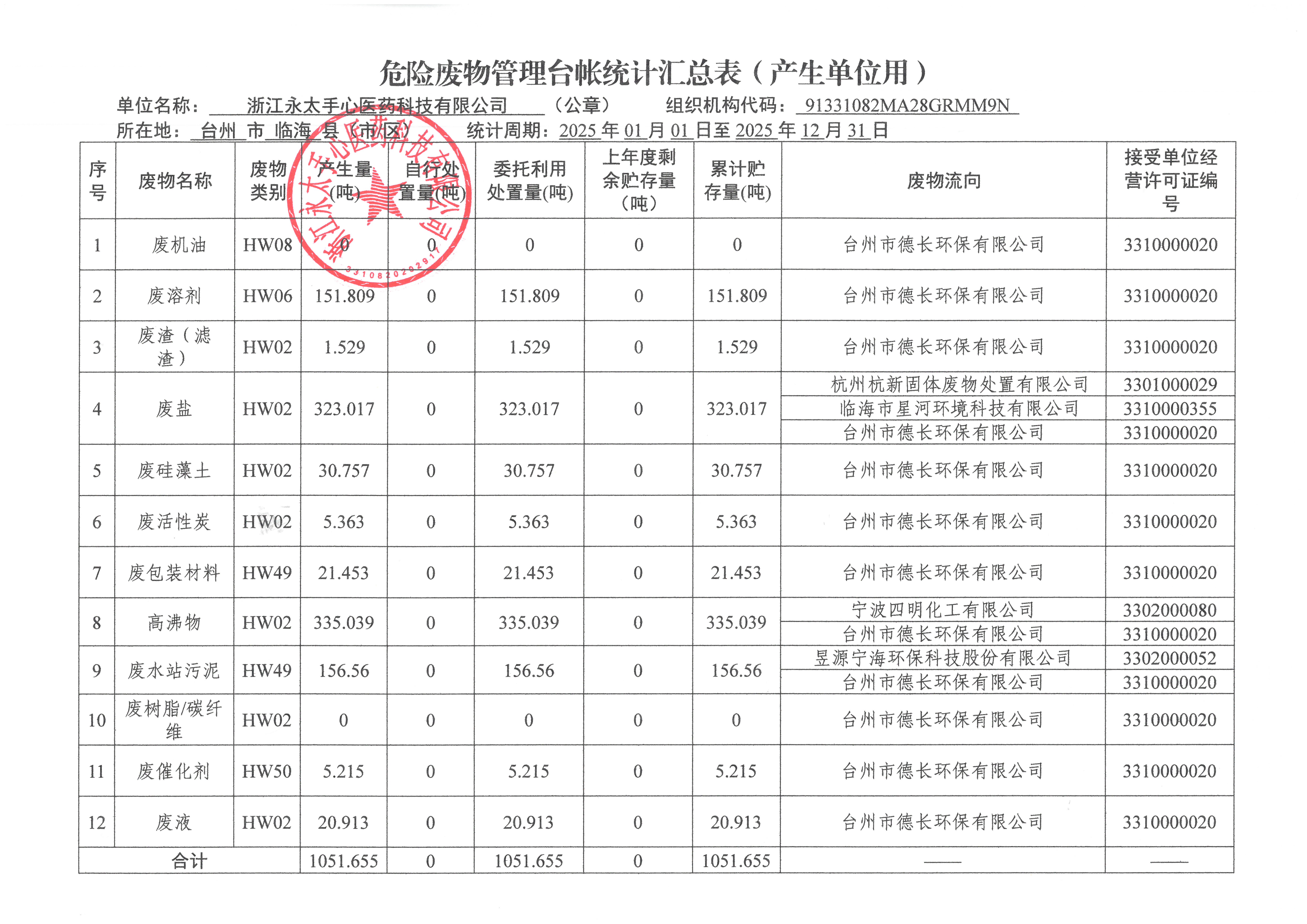 永太手心2025年危险废物管理台帐统计汇总表