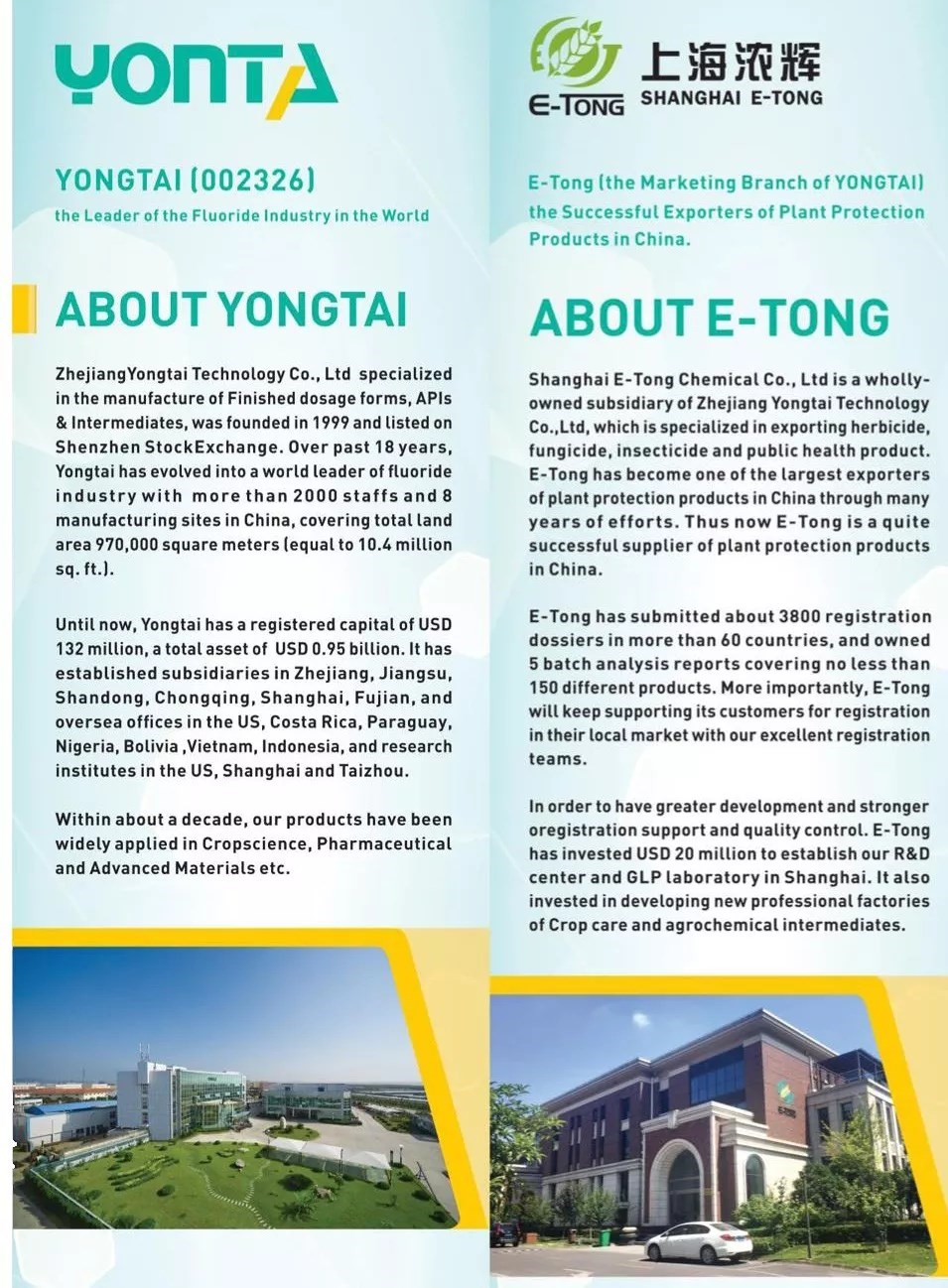 本次永太科技携全资子公司上海浓辉化工有限公司联袂出席,将为您呈现农药制剂、原料药、中间体、含氟基础中间体等业务,并提供定制加工服务。